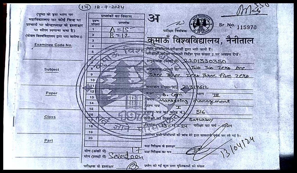 कुमाऊं विवि की ओर से कराए गए मूल्यांकन में बड़ी गड़बड़ियां सामने आ रही हैं। बीएससी तृतीय वर्ष की छात्रा की उत्तरपुस्तिका में हुई मूल्यांकन की गड़बड़ी का मामला प्रमुखता से प्रकाशित किया था। वहीं अब बी.कॉम तृतीय वर्ष के छात्र की उत्तरपुस्तिका मिलने पर यहां भी गड़बड़झाला सामने आया है। छात्र ने नाम और अनुक्रमांक गोपनीय रखने की शर्त पर बताया कि मार्केटिंग मैनेजमेंट का पहला पेपर अच्छा गया था लेकिन मार्कशीट में 50 में से सिर्फ 20 नंबर ही आए।